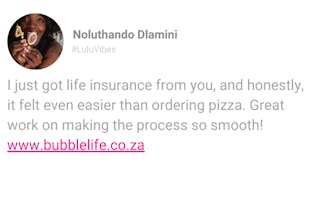 Bubble was founded with a mission to create the South Africa's most loved insurance brand. Everything we do revolves around you, our customer. We offer super quick cover, no waiting periods, significantly lower premiums for superior cover and in most cases no medical exams.